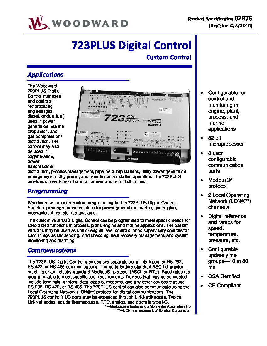 This generator control is suitable for use in a variety of applications. Model 8230-3011 can be used in marine applications for diesel-electric propulsion and auxiliary generators, as well as base loading and island mode systems. This 723PLUS Generator Control also has an MW Control mode, which provides stable functionality in applications with a weak grid and large frequency excursions. Woodward 723PLUS Generator Control Manual 37827 has complete details on the functionality and suitable applications of the 8230-3011 Generator Control.