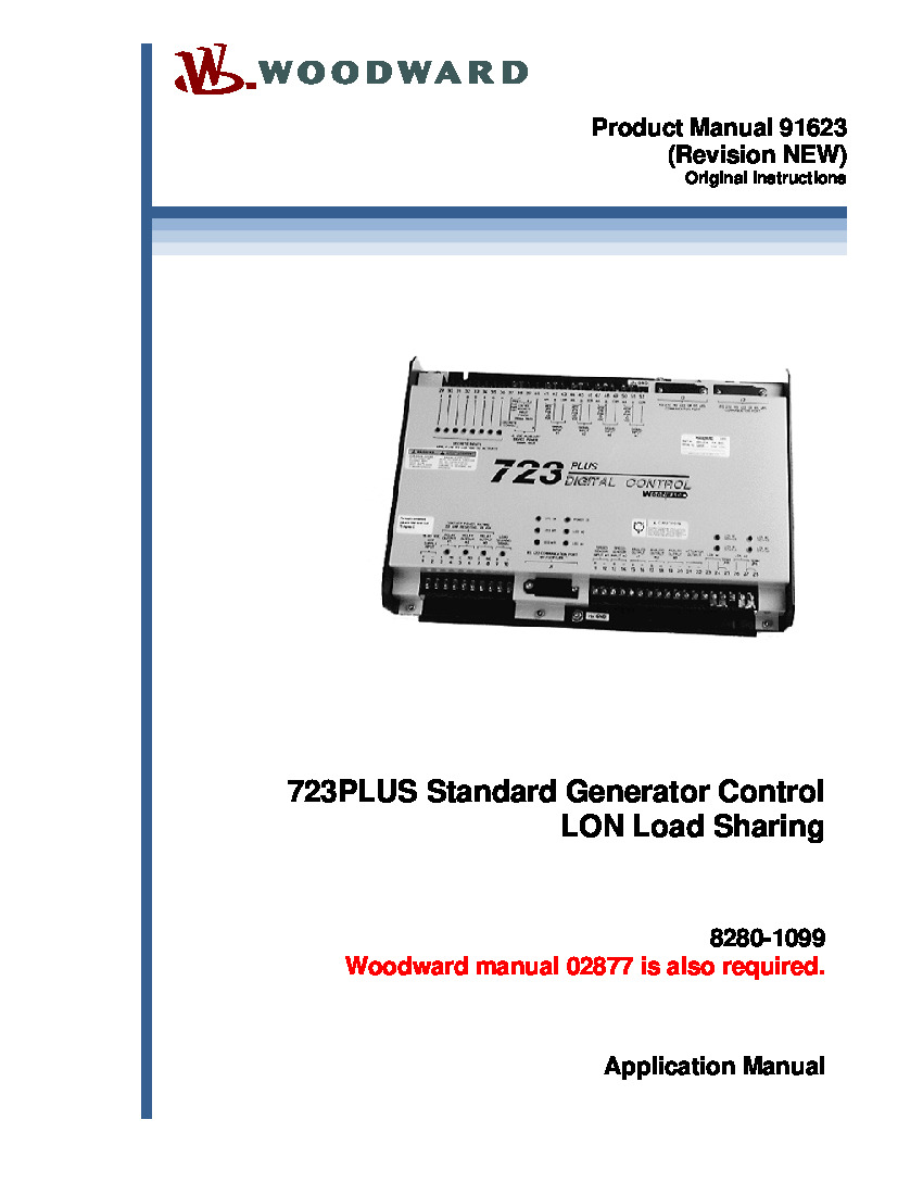 Part 8280-1099 is a control model in the Woodward 723PLUS series. This model is the 723PLUS Standard Generator Control for LON Load Sharing. Functions of the 8280-1099 unit include speed control (isochronous & droop), load-sharing control via legacy load-sharing lines, and load-sharing control via LON communication, with up to two tie-breakers.