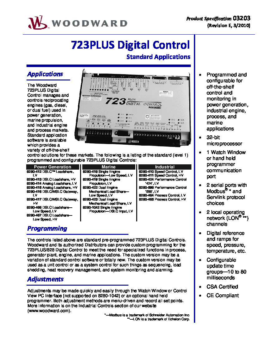 Several communication ports on this unit support various options for interfacing with the control for configuration, monitoring, and troubleshooting. These options include Watch Window; the Woodward Hand Held Programmer; 723PLUS Marine SEP Control View software; and RS-232, RS-422, and RS-485 communications. More information on these 723PLUS Digital Speed Control accessories, including the part numbers for each communication, can be found in Woodward 723PLUS Product Manual 02880.