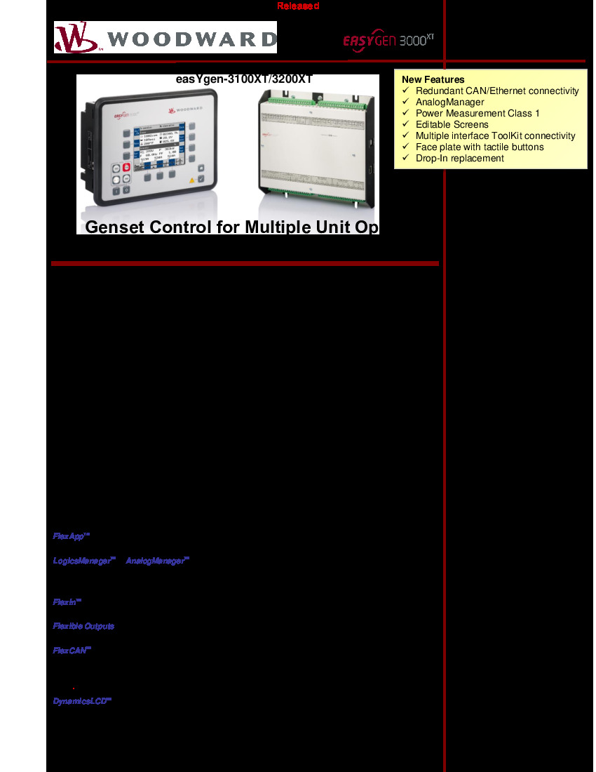 The easYgen 3000 series of devices are controller units for engine generator system management applications. The devices are largely designed to manage gas and steam turbines and compressor modules. The easYgen 3000 control units are able to be used in several applications such as: co-generation, stand by, AMF, peak shaving, import and export, or distributed generation. The easYgen 3000 series is also applicable for island, island parallel, mains parallel and multiple unit mains parallel operations. These products were all manufactured and produced originally by Woodward.