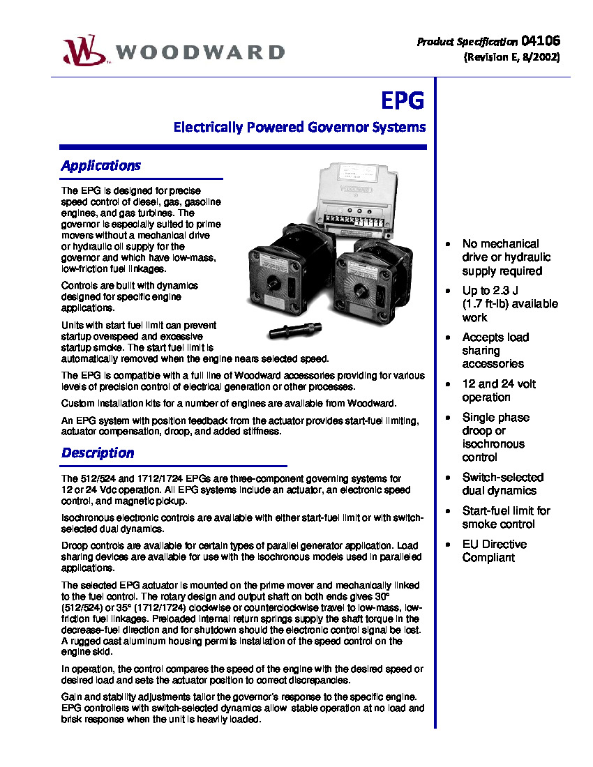 Adding this product to a magnetic pickup and actuator will create a complete EPG system that can work on prime movers without a mechanical drive or hydraulic supply.