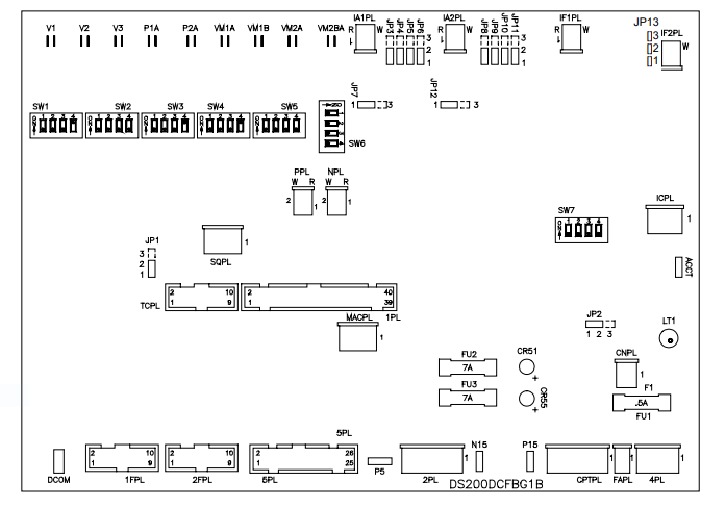 Two LED indicators and one neon indicator provide diagnostic information regarding the status of the drive's fuses. Three protective fuses are integrated into the board to prevent current interruptions. Five test points are available on the board for easily checking voltage levels. Users can adjust configurable settings via twelve jumpers and seven DIP switches to meet specific job requirements.
