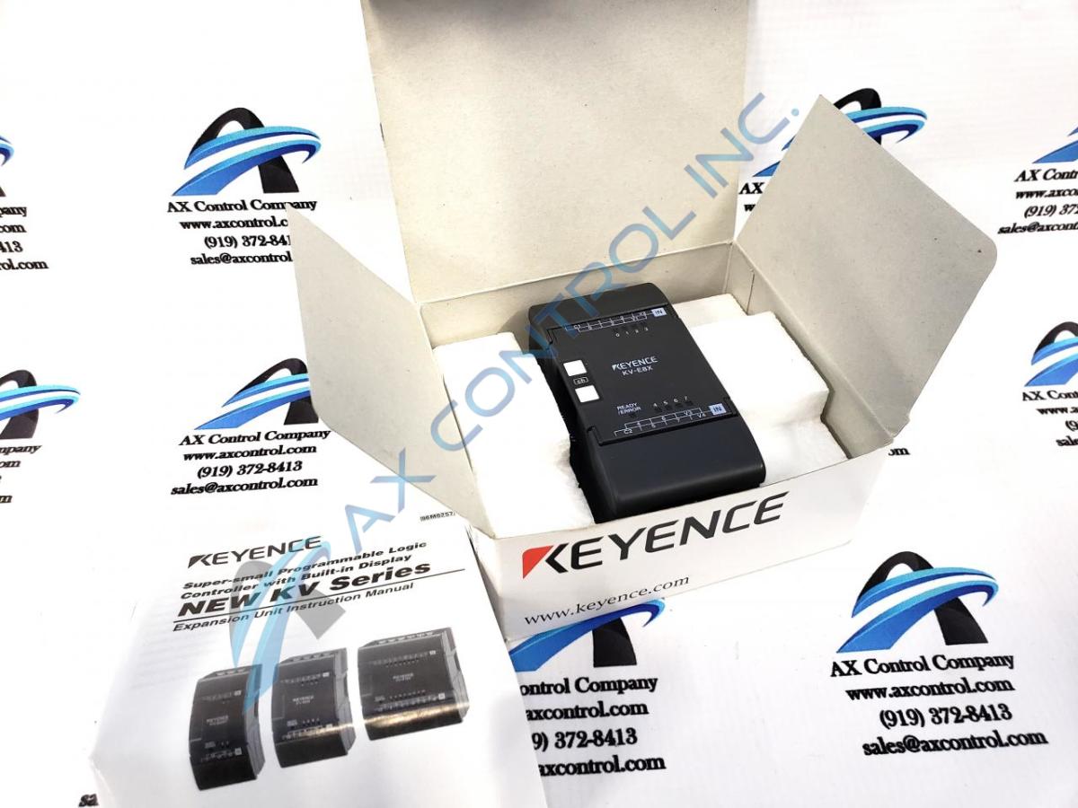 KV-E8X is an eight (8) input device made by Keyence. The KV-E8X has a minimum ON voltage of nineteen (19)V. The maximum OFF current of the KV-E8X is two(2)mA. The KV-E8X by Keyence has an input time constant (switchable between two (2) levels by using special auxiliary relays 2609 to 2612) with a ten (10) ms ± twenty percent (20%), ten(10) µs ± twenty(20%) for both rising (OFF to ON) and falling (ON to OFF) edges. The KV-E8X has a vibration resistance and a continuous vibration frequency of ten (10) to fifty-seven (57) Hz. The KV-E8X in twenty-four (24) V mode has an input maximum rating of twenty-six point four (26.4) VDC. The KV-E8X has an input voltage of twenty-four (24) VDC, five-point three (5.3) mA. The KV-E8X has an impedance of four point three (4.3) kΩ. The Keyence KV-E8X also has four (4) common inputs. The KV-E8X has seven (7) screw ports along the top and the bottom of the device. The KV-E8X is labeled in purple writing along the top it reads C1 zero through three (C1 0-3) than V1 and V2, with an IN port on the top left of the device. Along the bottom of the device is labeled C2 four through seven (4-7) V3 and V4 with an IN port on the bottom left of the device. The Keyence KV-E8X also has a black and white wiring harness on the left, in order to easily connect to another device.